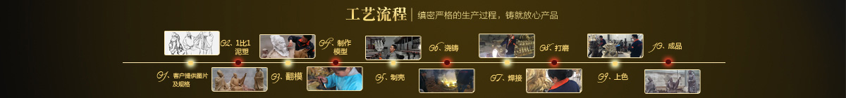 制作一件完美的人物雕塑,最重要的步驟就是制作泥塑模型,然后再用工業(yè)硅膠拓印、翻模。所以人物雕塑的姿態(tài)、神情生動、莊嚴與否直接影響最終人物雕塑的品質(zhì)。所以我廠一直對人物泥塑模型的制作格外重視。我廠以雕塑為本,以藝術(shù)為根,挾中華文化之傳統(tǒng),盡顯淋漓盡致。我們本著大膽創(chuàng)新、勇于突破的精神,以追求卓越為導(dǎo)向,堅持寧缺勿濫為原則,并可依照您提供的要求,為您量身設(shè)計制作。我廠人才濟濟,有智慧嚴謹?shù)墓芾戆嘧樱袑I(yè)技術(shù)精湛的人物雕塑制作人才和專業(yè)的施工隊伍。他們不僅具深厚的文化藝術(shù)底蘊,更汲取當代雕塑精華,博采眾家之長,作品既有嚴肅莊重寫實題材,也有輕松前衛(wèi)的抽象題材,表現(xiàn)手法上浪漫主義中不乏樸實,現(xiàn)實主義中蘊涵著激情,設(shè)計理念深刻詮釋著藝術(shù)的精髓,把古典主義和后現(xiàn)代主義完美的融合,將佛像雕塑藝術(shù)演繹為力的凝聚、美的體現(xiàn),讓人們感受到的不僅是一種藝術(shù)的浪漫與優(yōu)雅、粗獷與悲壯、更是豐富的優(yōu)秀藝術(shù)寶藏和文化傳統(tǒng),讓您在藝術(shù)與文化中穿流,在時空中飄蕩,使靈魂在藝術(shù)的海洋洗禮。 MORE+
